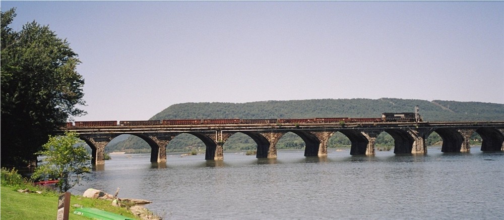 ![]() The Pennsylvania Railroad Bridge over The Susquehanna River at Harrisburg, PA looking north with the long since vacated Reading Railroad Bridge in the background along with Harrisburg's fame River Walk / River Front Park. |