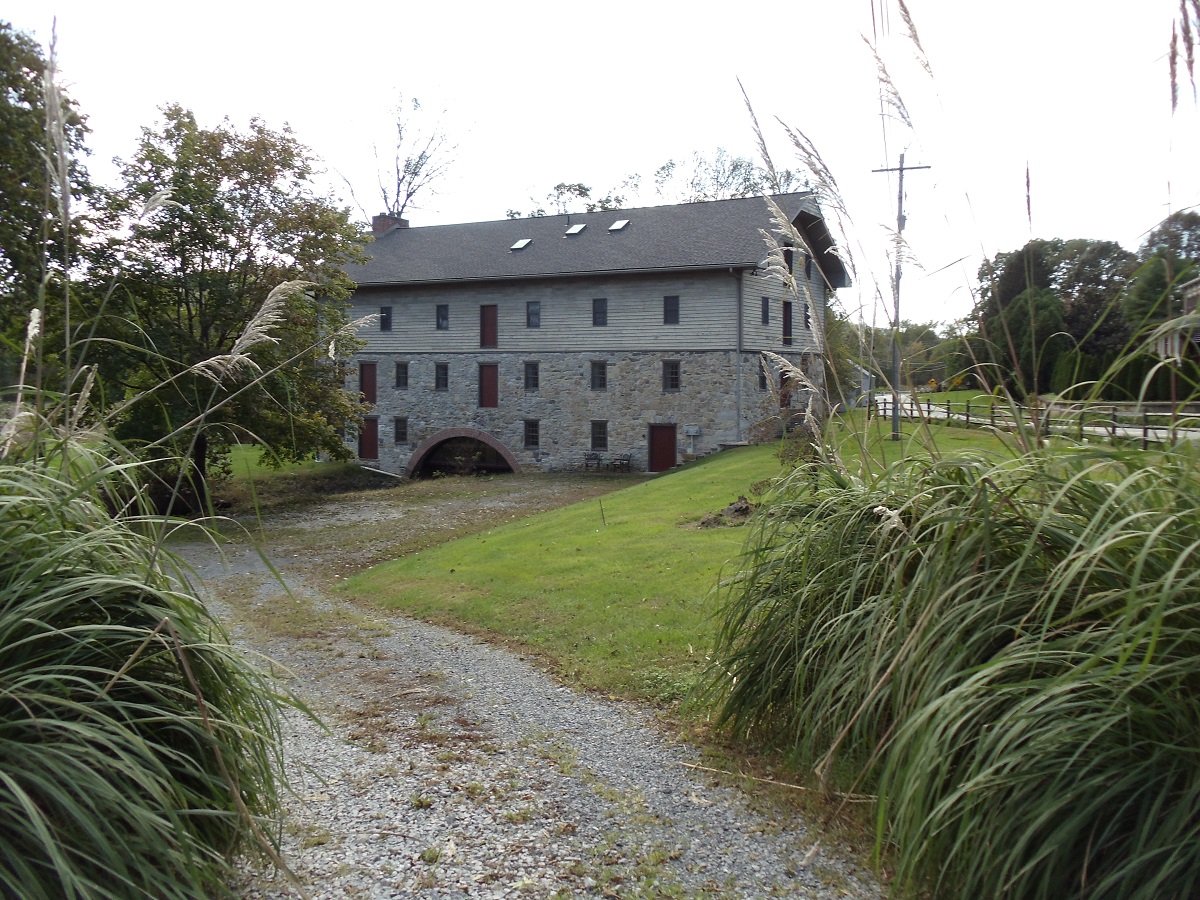 An old stone barn ( once a mill ) built over a small stream with a bridge ( the arch ) going over it. |