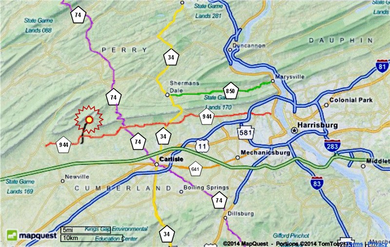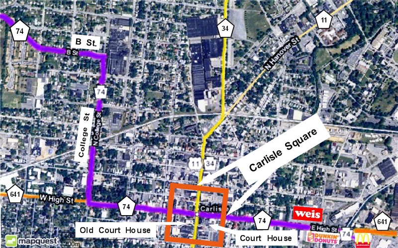 Staying on Rt. 74 North. You will enter The Carlisle Square : (High St. / Hanover St.) . Three Traffic Lights after The Square, You will Turn Right, and Follow Rt. 74 North on to College Street. 6-8 Blocks later, You will Turn Left on to B Street and follow Rt. 74 North out of Town. At this point you are a little over 5 Miles to Rt. 944. ![]() |