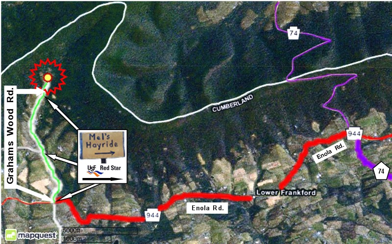 At Rt. 74 North / Rt. 944 , Turn Left onto Rt. 944 West (Now called Enola Rd.) . At Rt. 944 / Grahams Wood Rd. You will see sighs saying : Mel's Hayride, and USF Red Star.